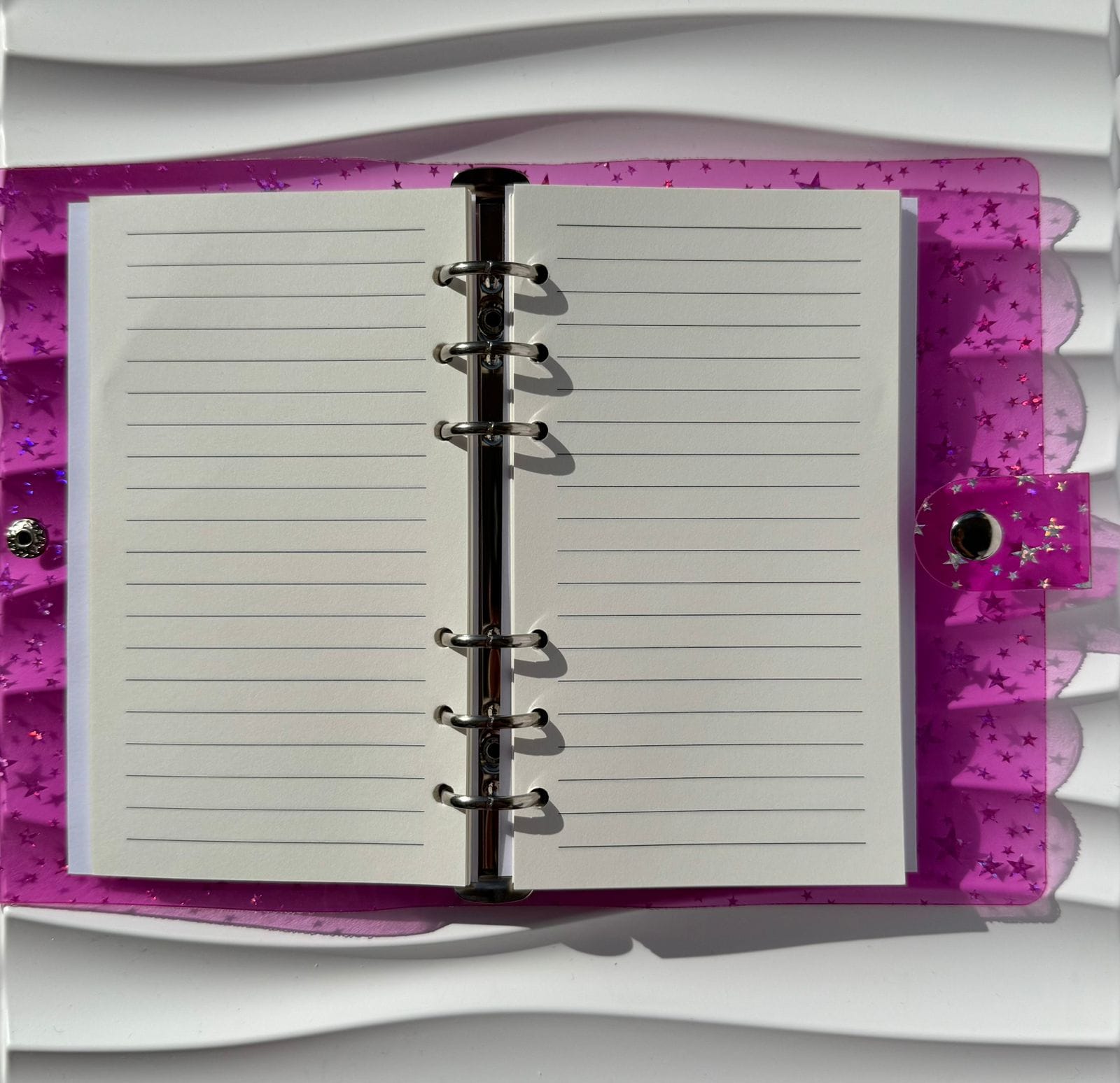 Blloku përmban fletë të vijëzuara, të përshtatshme për shkrim të qartë dhe të rregullt, ndërsa sistemi me unaza lejon hapje të lehtë dhe përdorim komod. Kapaku transparent me detaje dekorative i jep një pamje unike dhe elegante, duke e bërë tërheqës edhe si dhuratë.
