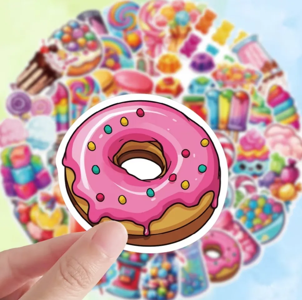 Shto ngjyra dhe energji pozitive në krijimet e tua me Stikera Dekorative Candy & Sweet. Kjo përzgjedhje përfshin modele të ndryshme me ilustrime të ëmbëlsirave, pijeve shumëngjyrëshe, karameleve dhe elementëve playful.